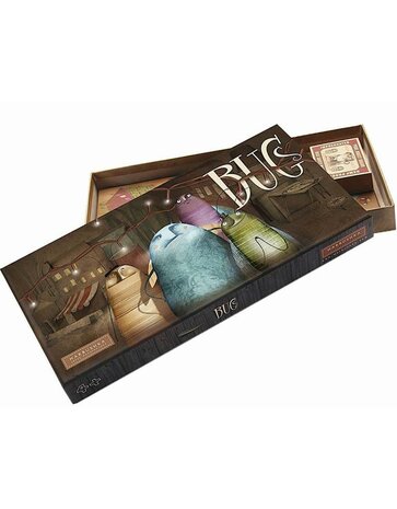 Inhoud van dit coöperatieve spel: 1 spelbord, 1 luciferdoosje, 20 insecten, 2 dobbelstenen