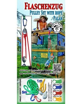 Inhoud: 5 meter touw 2 katrollen en 2 karabijnhaken, 1 bevestigingstouw De touwen zijn 0,8 mm dik Tot 15 kilo belastbaar.